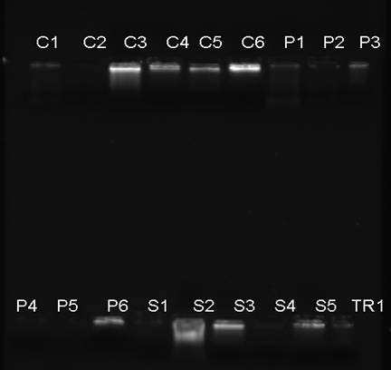 Further, seminal stains were stored for long duration, for one year and three months (March 2004-June 2005) at room temperature (varying according to Indian climatic situations). The seminal stains were preserved without any preservative and stored on different textures of cloths like polyester (P), silk (S), cotton (C) and tricot materials (TR). The DNA was extracted successfully only from one out of two cotton specimen and the yield was estimated as 35.6 ng. The other sample did not yield any DNA, could be due to decomposition or degradation. For polyester material, DNA yield varied from 5.7ng to 23.3 ng (Fig.5). From silk material DNA yield was observed as 7.9 ng and 33.8 ng yield was obtained from tricot material. Thus, suggesting that the cotton material is better source for such analysis (Table 5). Therefore, the use of cotton fabric for swabs for collection of seminal stains from vagina and other areas from body is the best among all fabrics studied.
