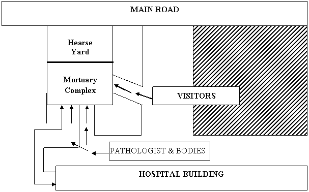 The access to the unit should have a covered area along with parking space for vehicles leading to the mortuary complex. This acts as a protection in wet weather and as a screen from adjoining areas. It is also desirable to have an exit to a subsidiary road and nearby car park.
