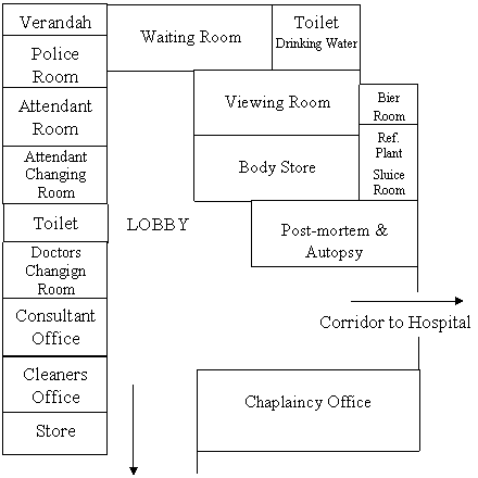 Planning Consideration: The location of the mortuary and autopsy room for obvious reason is always a problem and preferred to be in an obscure place. This is normally because both hospitals authorities and physicians by and large prefer to project their successes rather than exhibit the dead body, which apparently indicate their failure. This mind set requires to be changed and mortuary complex must be situated at a reasonable vicinity to the main hospital complex so that it is not only convenient to the hospital staff but also to relatives, police and other officials who are required to visit mortuary very frequently. It is also important for the security reasons that mortuary complex is near to the main hospital building.